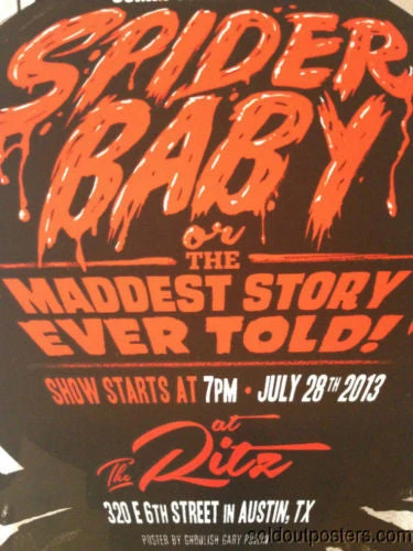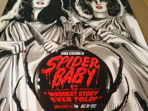 This is a Limited Edition print by Gary Pullin titled SPIDER BABY for MONDO! Spider Baby was created by Gary Pullin for Jack Hill’s horror black comedy and was unveiled at the screening in Austin, TX. This edition of 125 measures 18×24 perfect for a stock frame.
